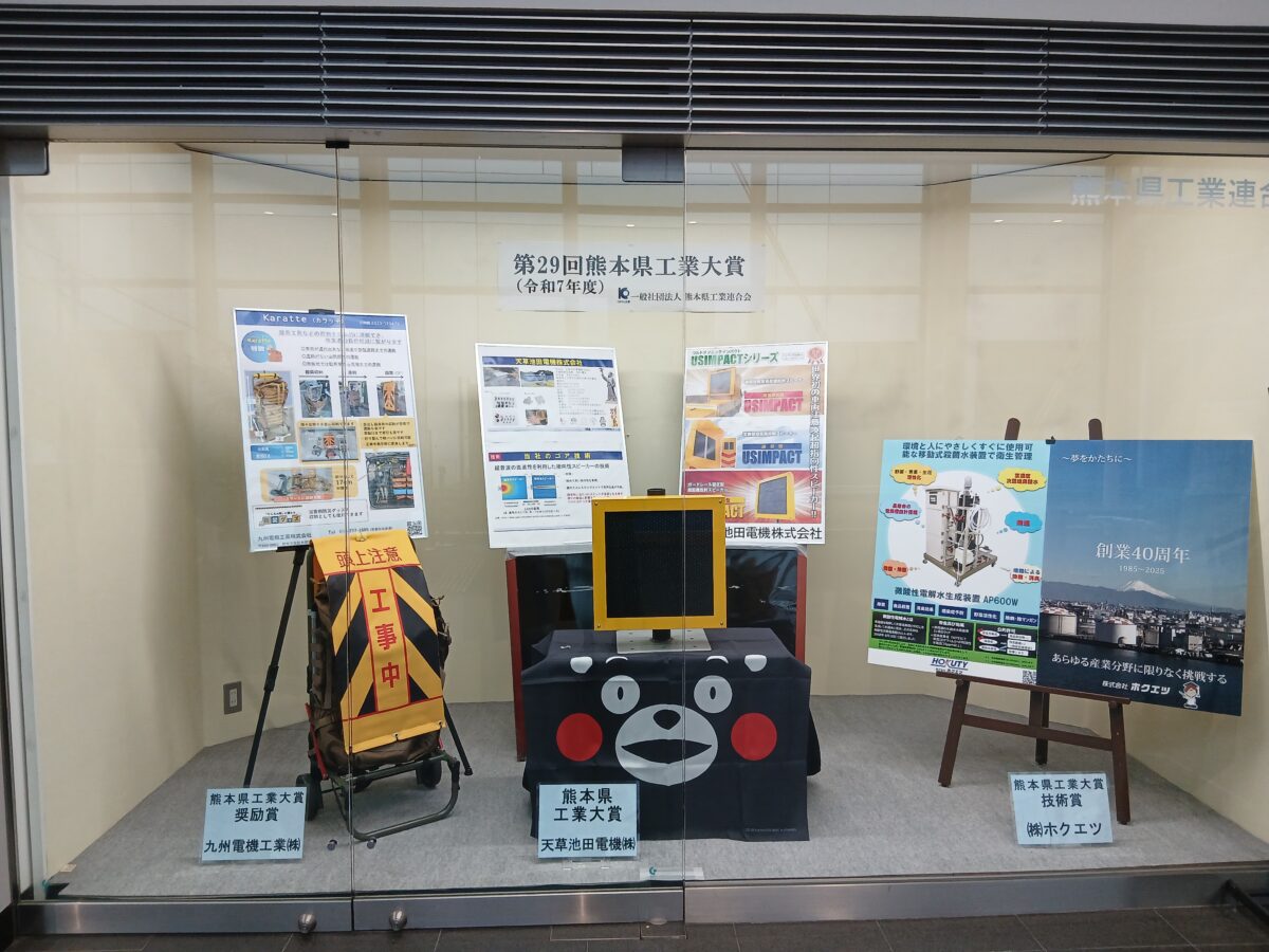 第29回(令和7年度)熊本県工業大賞が決定しました。受賞企業様、おめでとうございます。 令和8年4月より令和9年3月末まで1年間、グランメッセ熊本 展示ショーケースに受賞製品を展示しております。お近くにお越しの際は、ぜひお立ち寄りください。